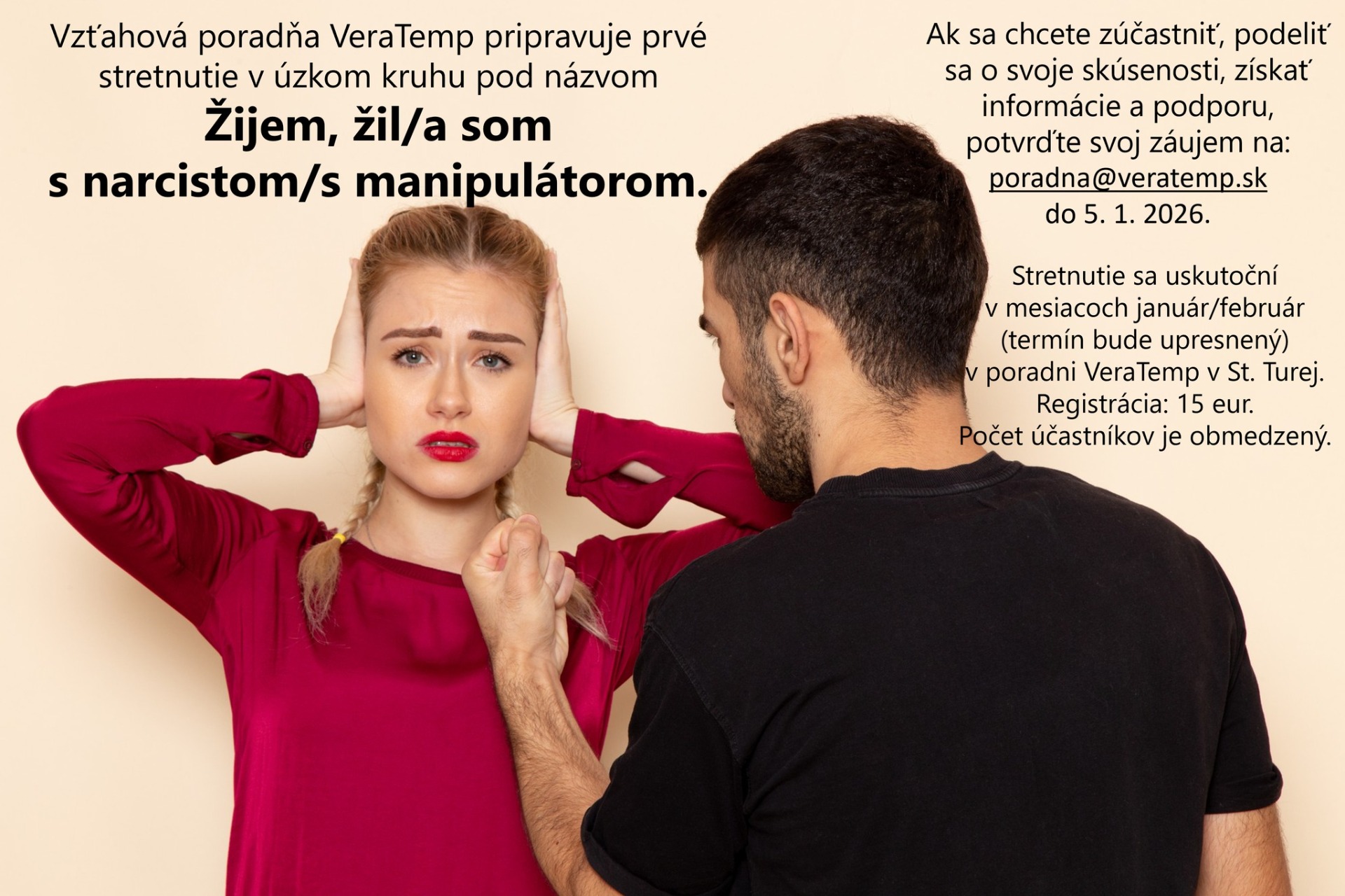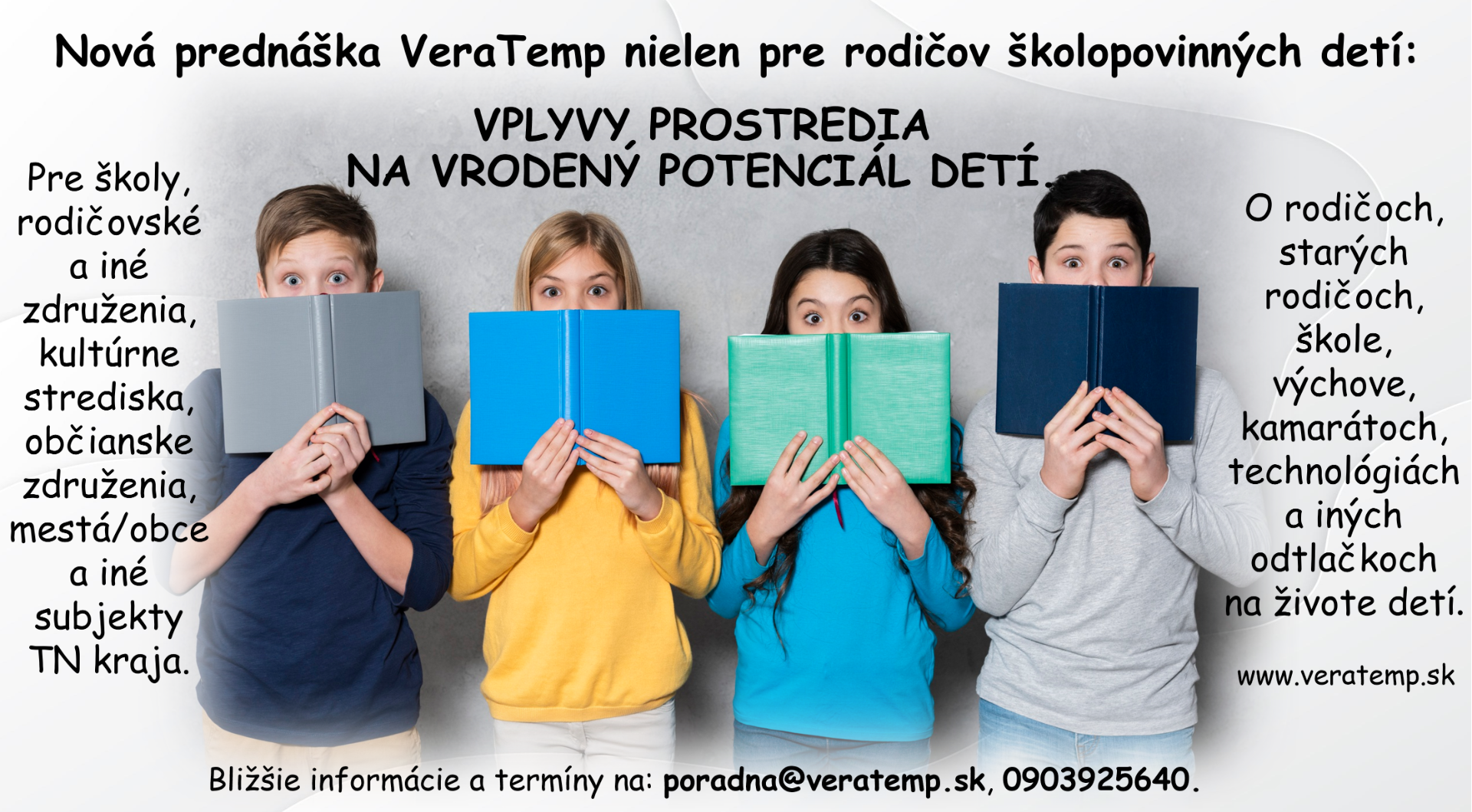 Inšpirujem sa v zahraničí a ponúkam malý netradičný formát vzdelávania rodičov Trenčianskeho kraja.Vážení rodičia, radi by ste si rozšírili obzory svojich rodičovských vedomostí a zručností, ale nemáte radi hromadné prednášky či vzdelávacie akcie so všeobecným obsahom a s neosobným prístupom? Temperamentová poradňa VeraTemp pre vás pripravuje malé podvečerné rozhovory s témami rodičovstva a výchovy detí rôzneho veku. Stretnutia sa uskutočnia v priestoroch VeraTemp (Športová 675, Stará Turá – internát SPŠ, 3. poschodie) s počtom 6 – 8 účastníkov so záujmom o avizovanú tému. Rozsah stretnutia: 60 - 90 minút. Vstupné: stretnutie/10 eur/osoba.Tento malý formát zaručuje na mieru šité informácie, osobný prístup a vzájomné zdieľanie skúseností rodičov a z tohto pohľadu bude každé stretnutie jedinečným projektom. Z kapacitných dôvodov je potrebné sa na jednotlivé aktivity prihlásiť vopred (poradna@veratemp.sk, 0903925640).V prípade záujmu rodičov z iných miest je možné túto aktivitu uskutočniť aj v inom meste/obci/na inom mieste (domácnosť, klub, centrum,...) s podmienkami podľa dohody.